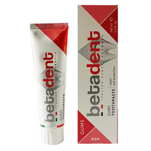 Зубна паста Betadent Gums - дбайлива та неабразивна формула, містить хлорид натрію та збалансовану дозу гексетидину, для щоденного використання, спеціально розроблена для лікування захворювань ясен і протидії утворенню бактеріального нальоту.